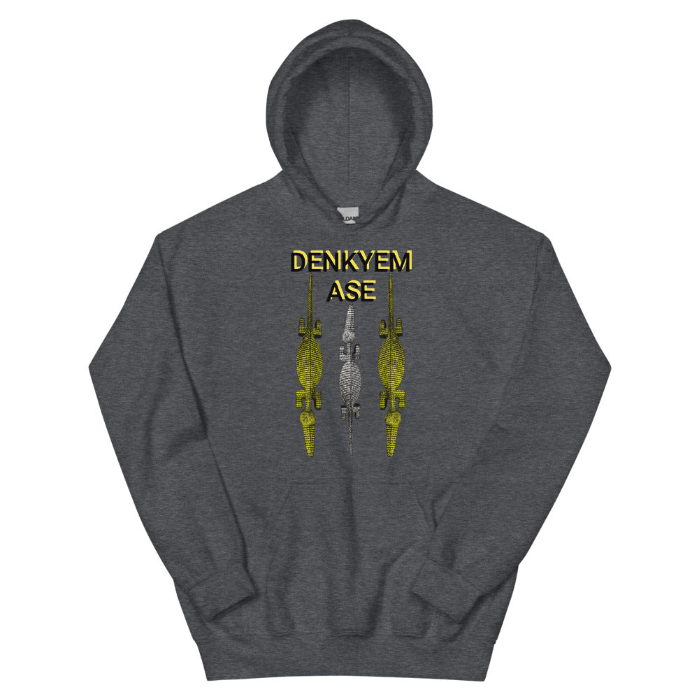 Make a Majestic and Powerful Statement with African Art! The Denkyem Ase logo draws inspiration from the majesty and power of African Art. This Unisex Hoodie makes a statement like no other...Denkyem Ase...and showcases Silver and Gold Bobo/Nuna/Bwa Crocodile Masks from Burkina Faso.